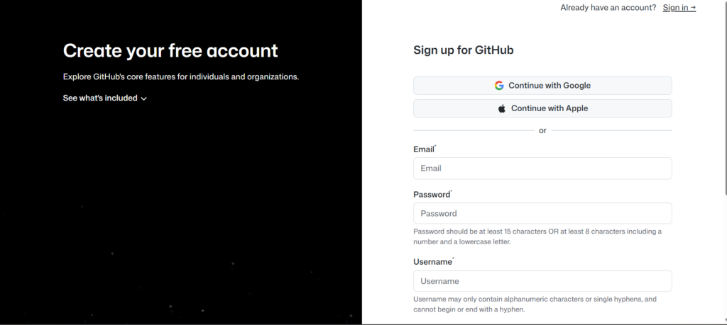 - Choose a username — this will be your public identity on GitHub, so pick something professional.